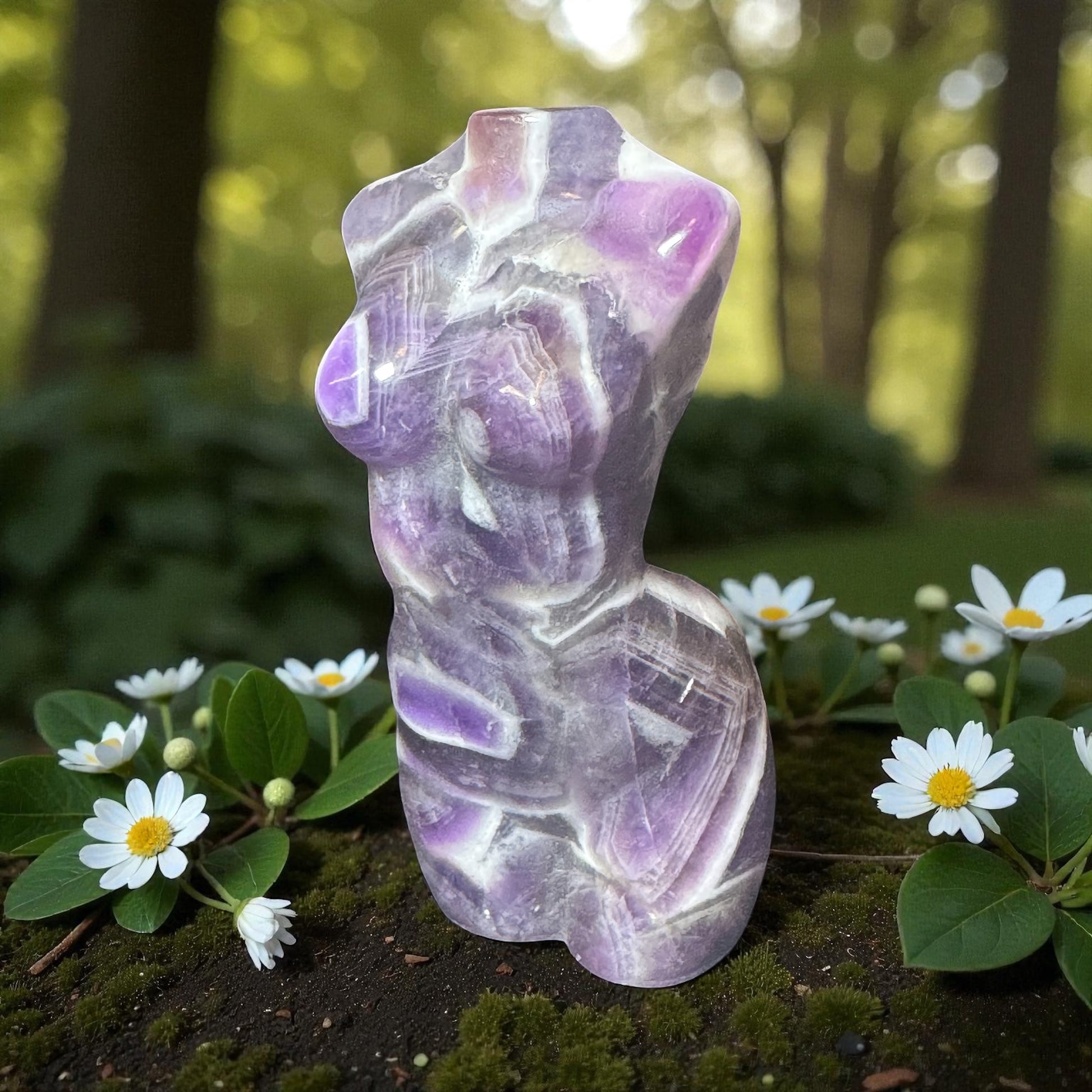 Sculpted from stunning Chevron Amethyst, this goddess embodies the perfect harmony of strength, beauty, and divine femininity. With striking bands of violet and white, each curve and line reveals the crystal’s natural artistry — a true one-of-a-kind piece carved by nature itself.
