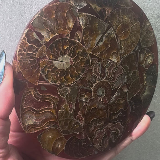 Bring ancient earth energy into your space with this polished ammonite fossil plate, a stunning natural specimen formed over millions of years. This 4.5” ammonite plate features rich earthy tones, beautiful chamber patterns, and a smooth polished finish—perfect for collectors, crystal lovers, and statement décor.